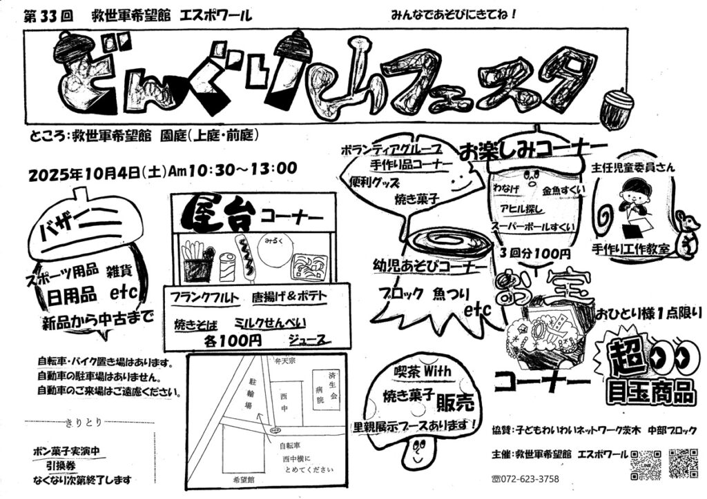 今年は、10月4日(土)に、どんぐり山フェスタを開催します。今年も地域の方、ボランティア、子ども“わいわい”ネットワーク茨木、エスポワールの多くの方々の協力を得て開催します。たくさんの方に楽しんでいただけたらと思っています。毎年大人気のお買い得な日用品バザーに、焼きそば、フランクフルト、唐揚げポテト、ミルクせんべいの屋台コーナー!上庭では、名物金魚すくいなどの遊びコーナー、美味しい焼き菓子もありますので、ぜひ遊びに来てください!