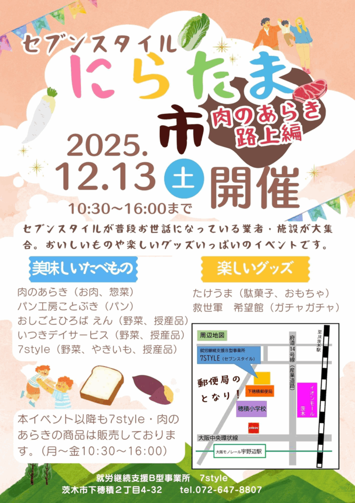 就労継続支援B型事業所 7styleさん主催“にらたま市”にて、里親ブースを出すことになりました。地道な里親啓発活動から、繋がった縁を大事にしたいと思います。ご興味のある方は、是非お立ち寄りください。日時:12月13日(土)10:30~16:00場所:就労継続支援B型事業所7style茨木市下穂積2-4-32TEL:072-647-8807美味しいお肉のお惣菜、野菜、焼き芋などなどお楽しみたくさんありますよ~!!