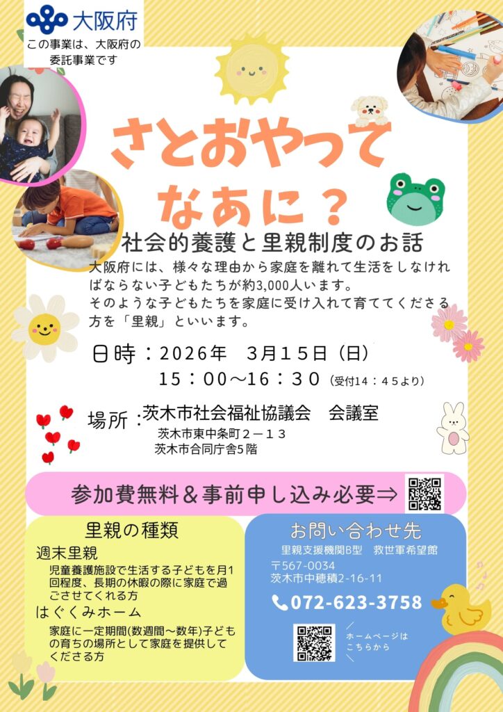 里親といってもいろいろな役割があります。一人でも多くの方に知って頂くことが子供の未来、地域社会が変わっていくことにもつながります。社会的養護の必要な子どもの養育についてと、当日は、養育里親さん、週末里親の体験談を予定しています。学生さんからどなたでも、関心のある方大歓迎です。日時:3月15日15:00~16:30場所:茨木市社会福祉協議会 会議室